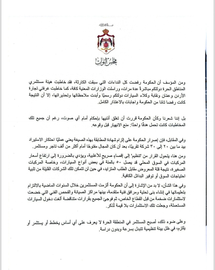 وبيّن أن هيئة مستثمري المناطق الحرة، وغرفتي تجارة الأردن وعمّان، ونقابة وكلاء السيارات خاطبوا رئاسة الوزراء والوزارات المعنية مرارًا عبر كتب رسمية ، الا ان الرد يأتي دائما بالاعتذار الكامل، معتبرًا أن "إغلاق قنوات التواصل الرسمية مع ممثلي القطاع يزيد من حدة الأزمة ويفقد القرارات الحكومية ثقة المستثمرين".