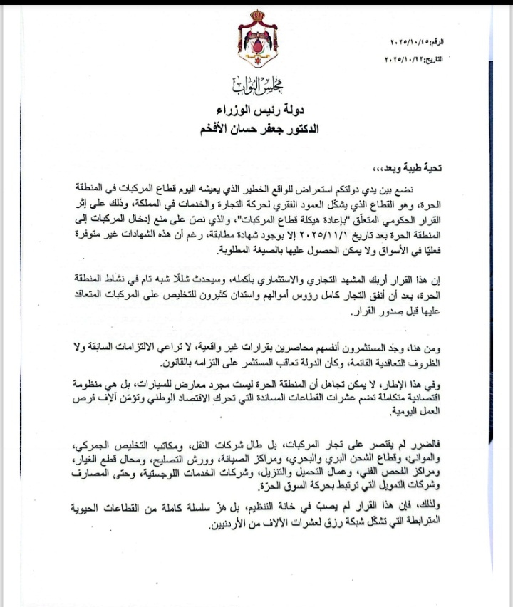 وجه النائب محمد عبد الله البستنجي مذكرة نيابية لرئيس الوزراء الدكتور جعفر حسان، محذرا فيها من التداعيات الخطيرة للقرار الحكومي المتعلّق "بإعادة هيكلة قطاع المركبات"، والذي نصّ على منع إدخال المركبات إلى السوق المحلي بعد تاريخ 1 تشرين الثاني 2025 إلا بوجود شهادة مطابقة، مؤكدة أن القرار سيصيب القطاع بالشلل التام ويلحق ضررًا مباشرًا بآلاف المستثمرين والعاملين.
