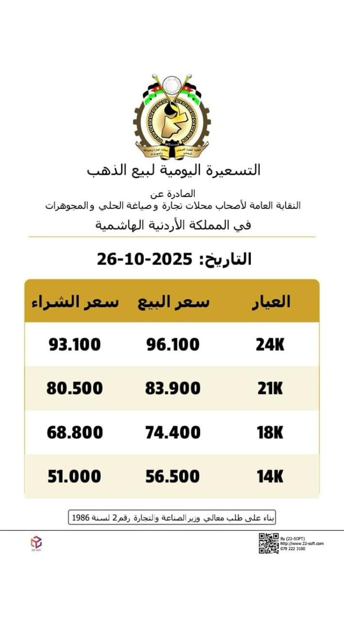 أعلنت النقابة العامة لأصحاب محلات صياغة وتجارة الحلي والمجوهرات استقرار أسعار الذهب في الأردن، اليوم الأحد.