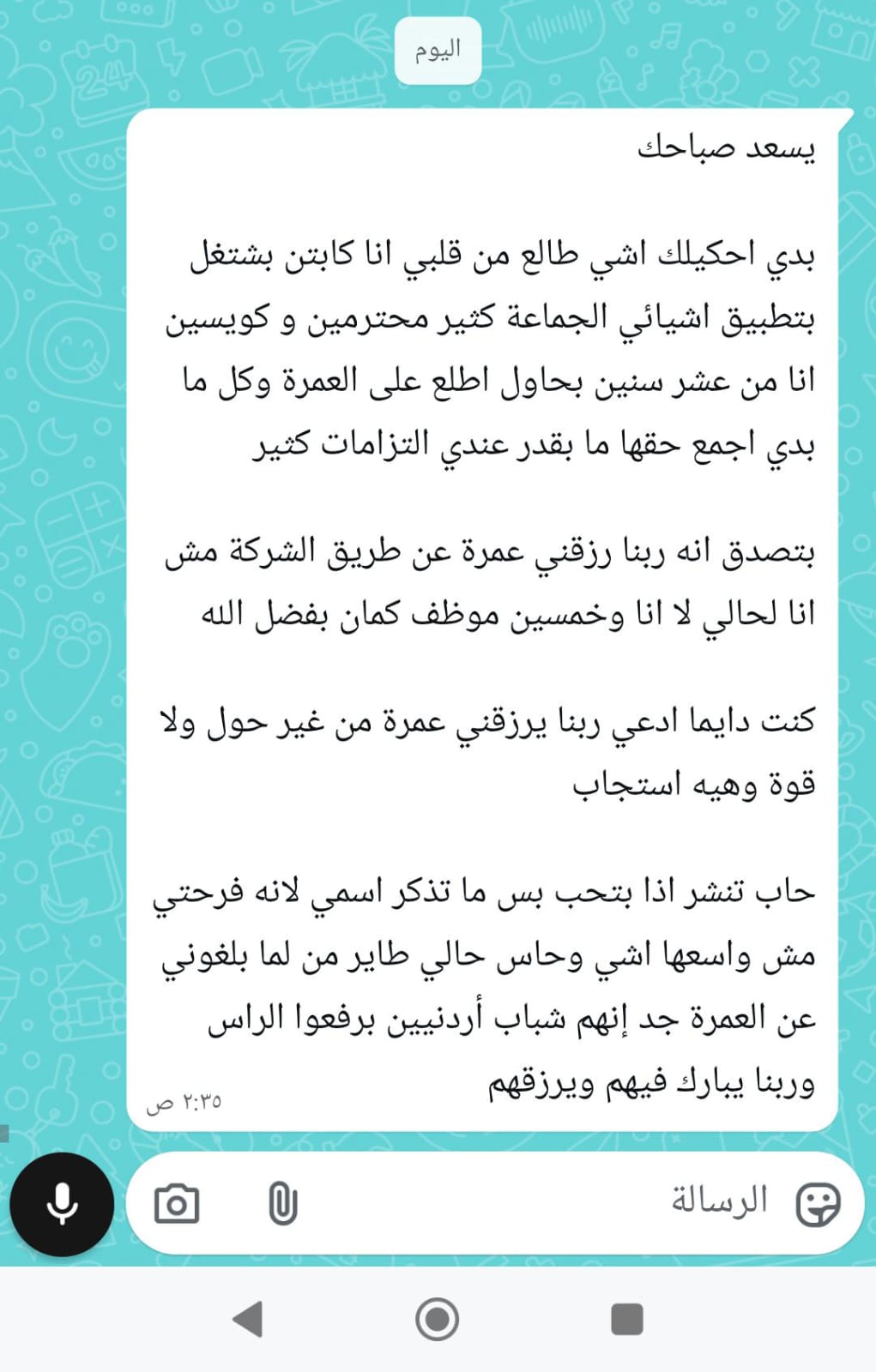 وأضاف أن الشركة أبلغته مؤخرا باختياره ضمن مجموعة من الموظفين لأداء العمرة على نفقتها، قائلا؛ مش بس أنا، خمسين موظف كمان راح يروحوا معنا، والله فرحتي ما بتنوصف، شباب الشركة برفعوا الراس، وربنا يبارك فيهم ويرزقهم."