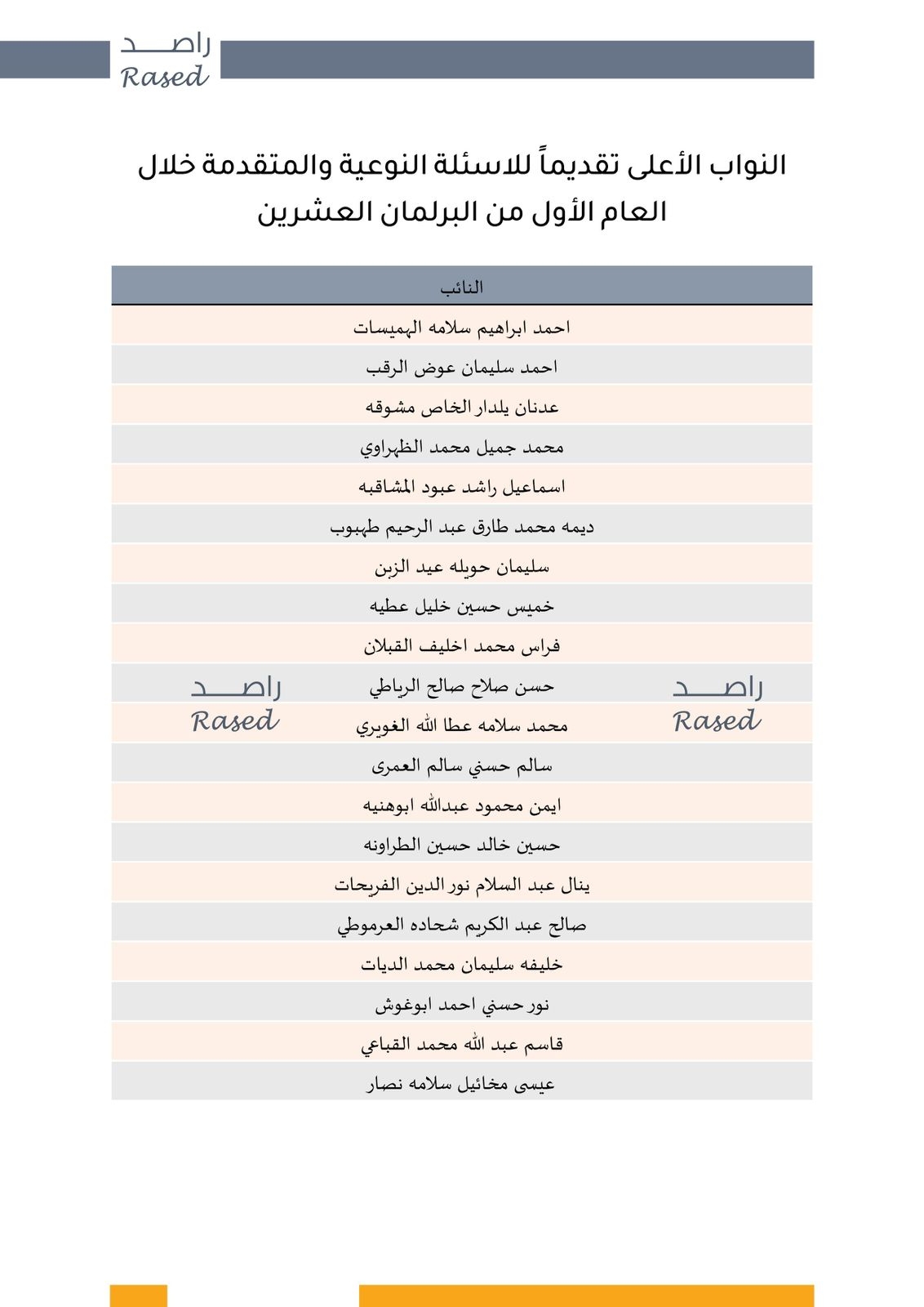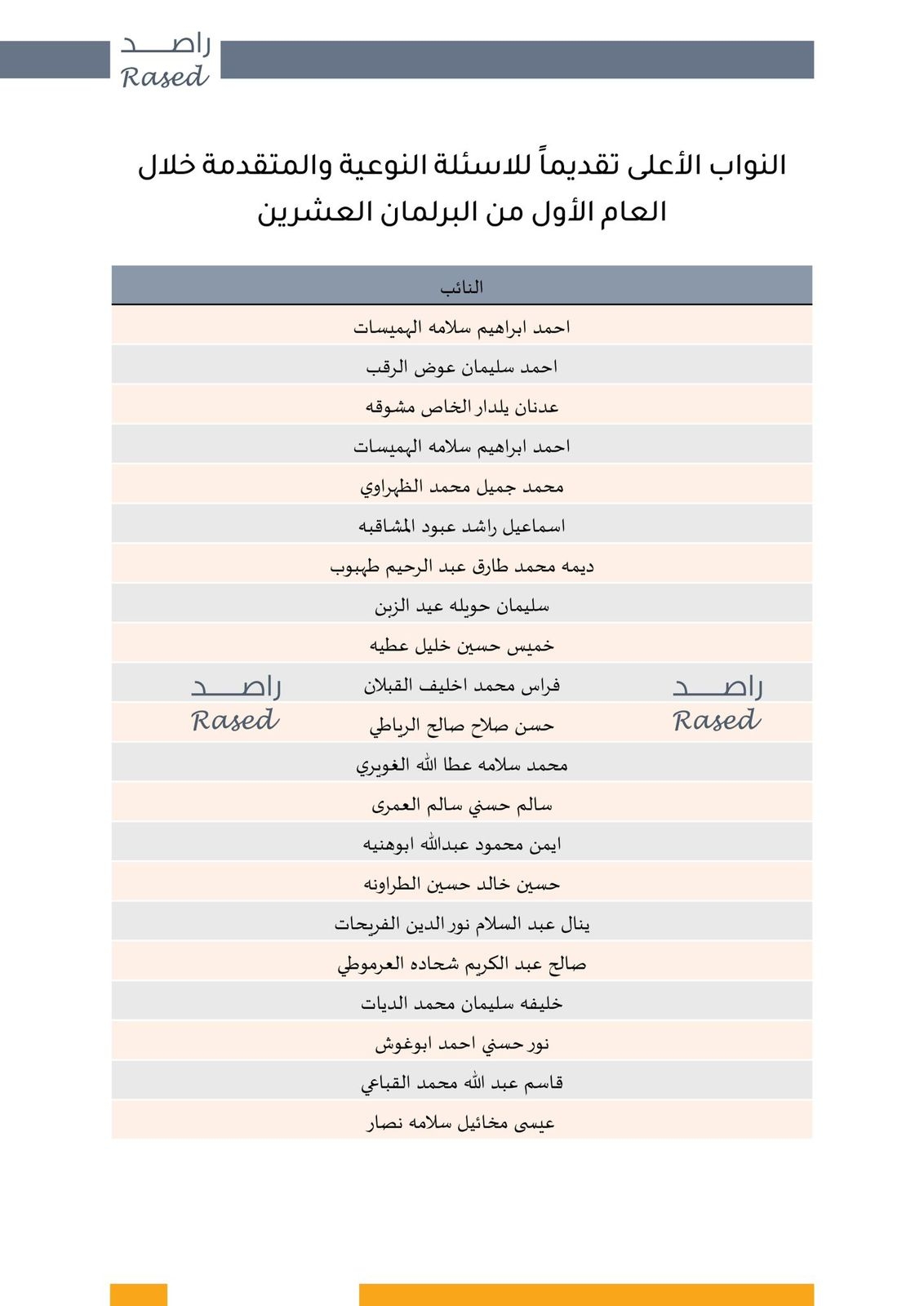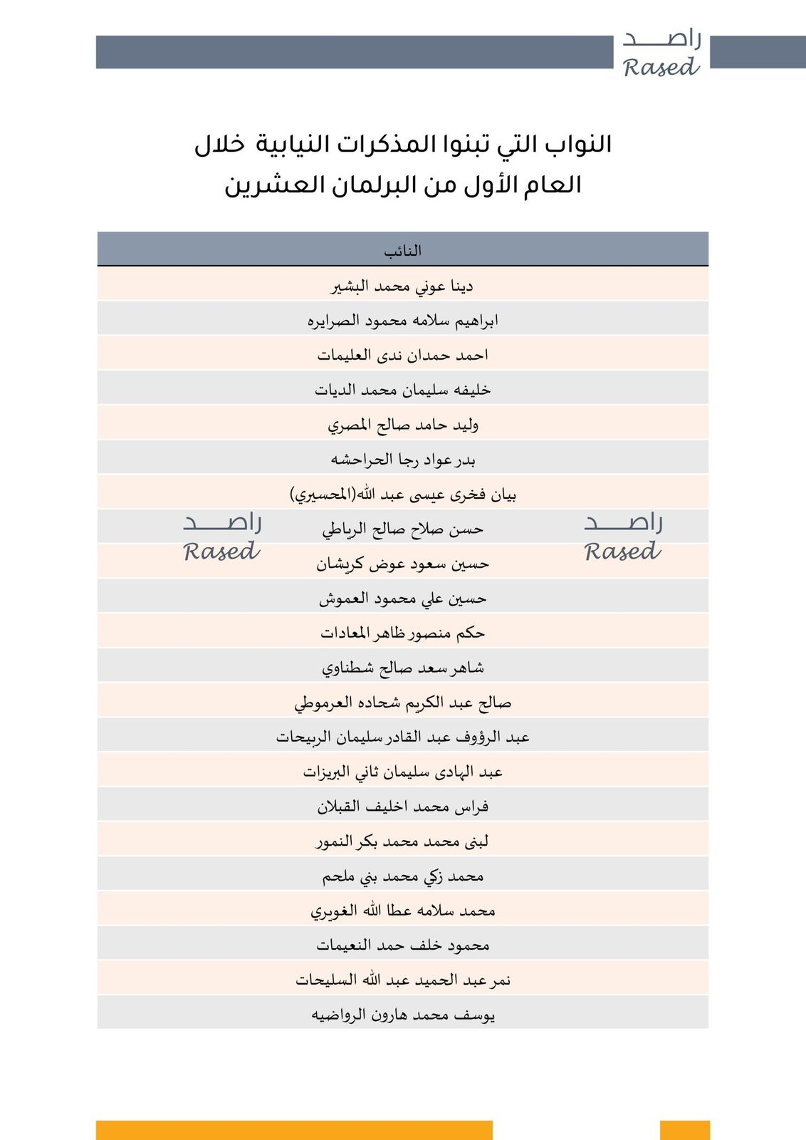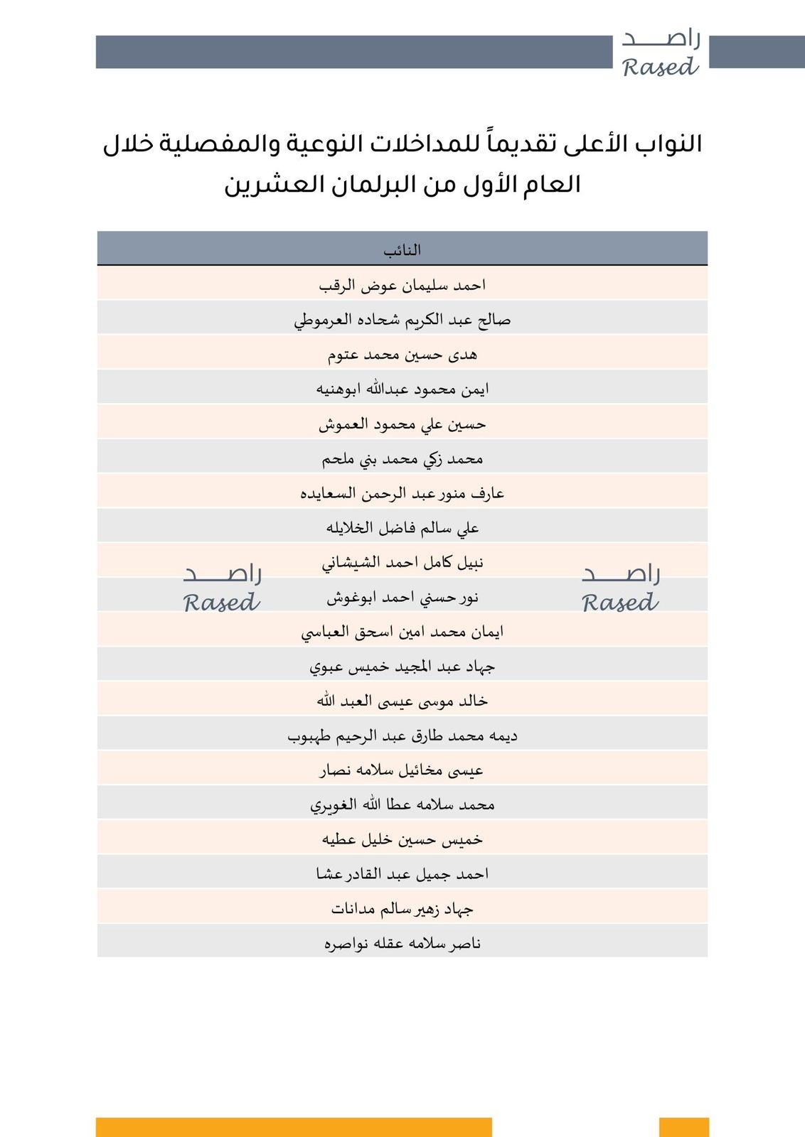 وفي سياق متصل، يعرض راصد قائمة أكثر (20) نائباً قدّموا المداخلات المفصلية والنوعية خلال جلسات البرلمان، والذين شكّلوا بمداخلاتهم ثلثي المداخلات النوعية والمفصلية المسجّلة في العام الأول.