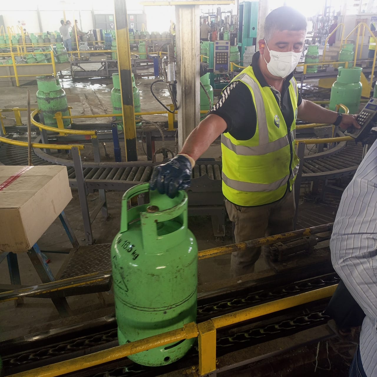 باستلام الأسطوانات الفارغة منذ وصول الشاحنات المحملة بالأسطوانات الفارغة إلى محطات التعبئة التابعة للشركة ، وتبدأ إجراءات الفحص الأولي بحيث يتم فحص كل أسطوانة بشكل دقيق للتأكد من خلوها من أي عيوب ظاهرة مثل الانبعاجات أو الصدأ أو التلف في الصمام.
