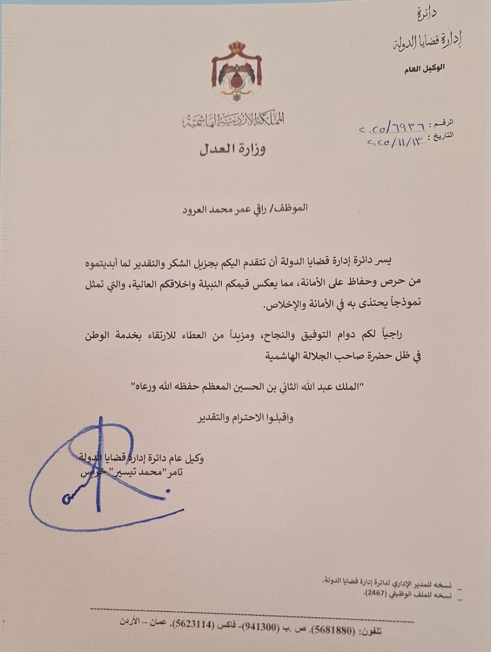إدارة قضايا الدولة تكرم الموظف راقي العرود الحباشنة على أمانته بعد عثوره على مبلغ مالي كبير وإعادته لأصحابه