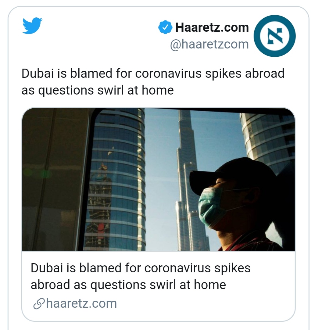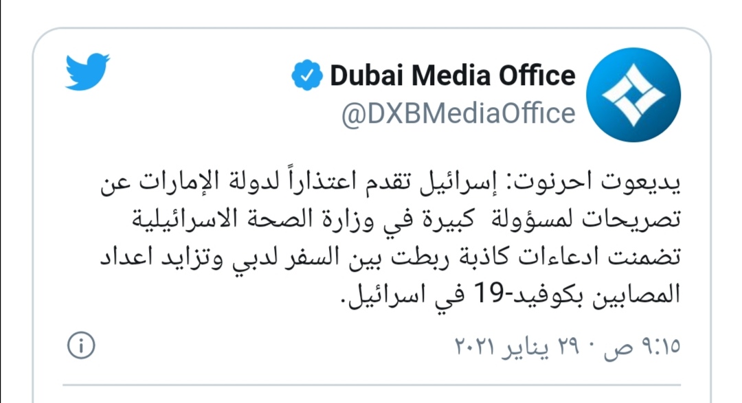ووفقًا لما قال المكتب الإعلامي لحكومة دبي، فإن صحيفة “يديعوت” أحرنوت الإسرائيلية، ذكرت أن تل أبيب قدمت اعتذارًا لأبو ظبي عن تصريحات رئيسة دائرة الصحة العامة في وزارة الصحة الإسرائيلية “شارون ألروي برايس”، ربطت فيها بين السفر لدبي وزيادة أعداد المصابين بكوفيد-19 في إسرائيل.