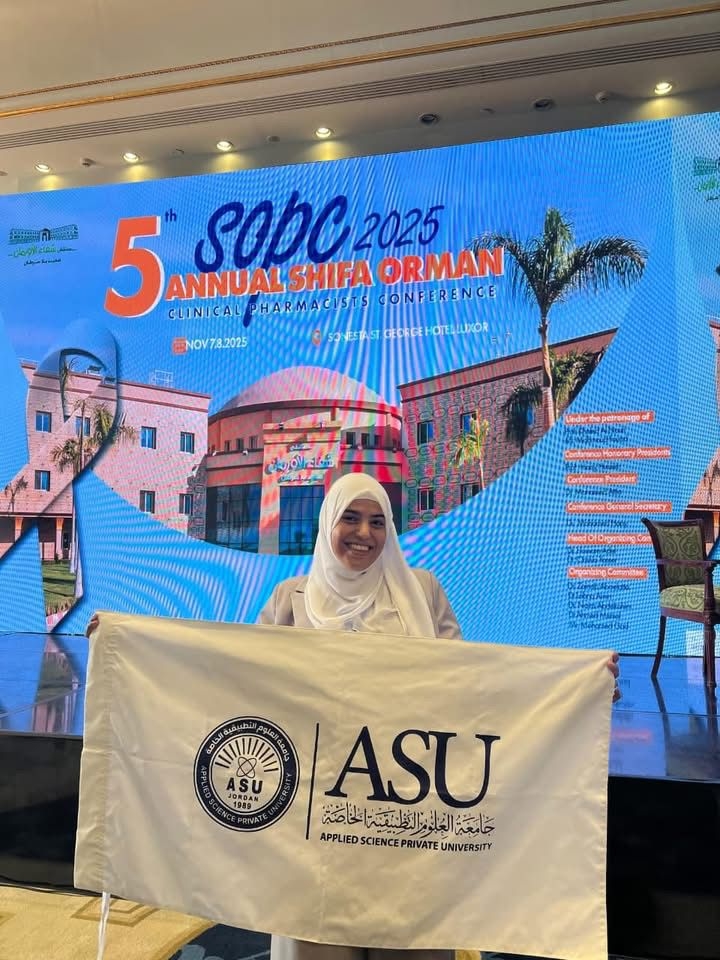 Rotana Zayed, a Pharmacy student at Applied Science Private University, achieved a remarkable win with the Oncology 5 team, securing first place at the First Specialized Youth Pharmaceutical Forum in Amman. The team presented an innovative pharmacogenomics project in collaboration with the King Hussein Cancer Center, standing out among more than 300 participants, the team earned a 10-day training grant at Shefaa Al-Orman Cancer Hospital in Egypt.