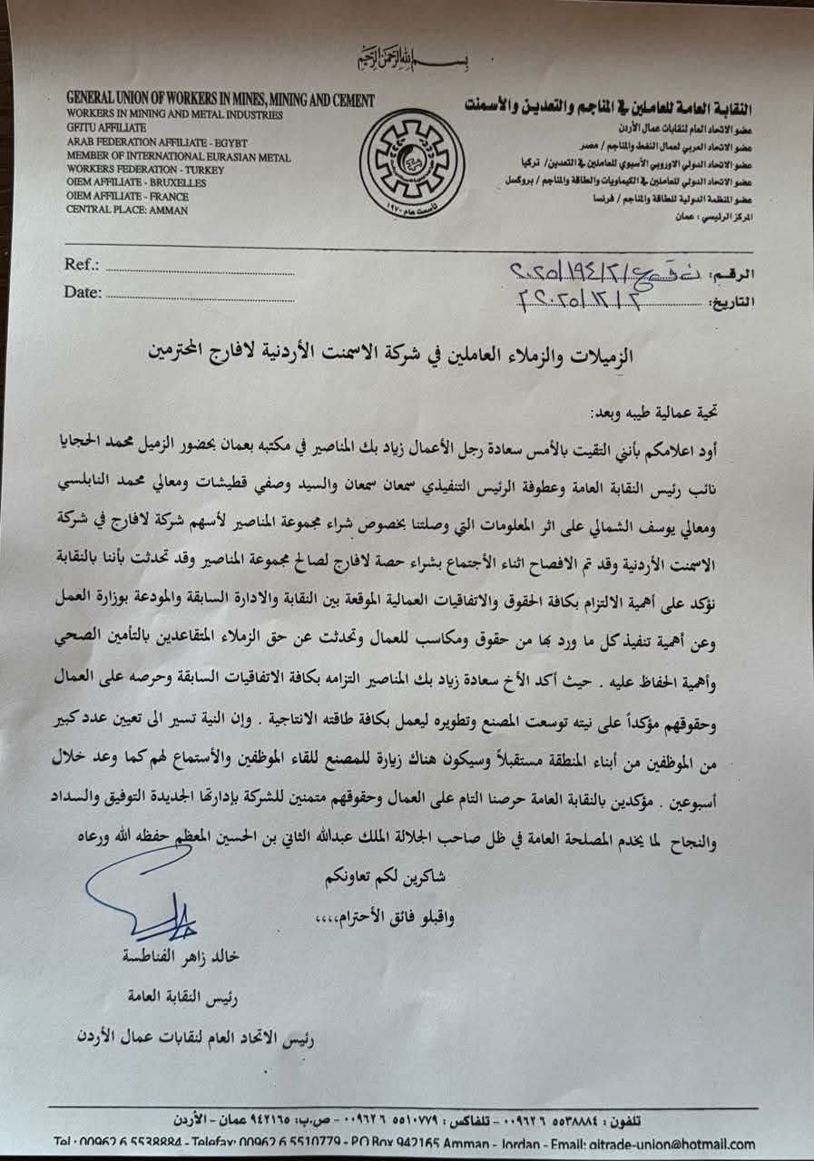 جاء ذلك في وثيقة صادرة عن الاتحاد العام لنقابات عمال المناجم والتعدين والصناعات المعدنية، وجهتها للعمال بعد لقاء جمع رئيس النقابة العامة خالد زاهر ووفد من مجلس الإدارة مع رجل الأعمال زياد المناصير.