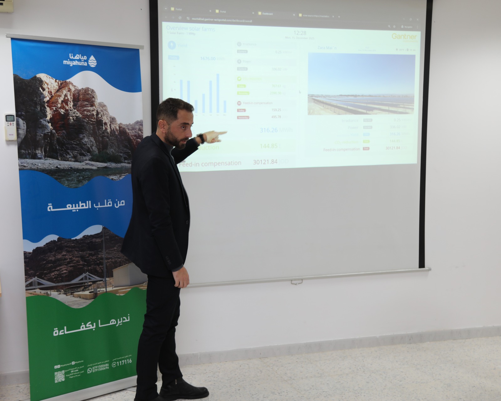 The project has a capacity of 1 megawatt with an annual production of 2.6 gigawatt-hours, at a cost of 1.2 million dinars, funded as a grant by the European Union (EU) and the European Bank for Reconstruction and Development (EBRD). It will contribute to saving a quarter of a million dinars annually in operating costs for the Jordan Water Company – Miyahuna. This project is part of the renewable energy initiatives launched with support from the EU and the EBRD, valued at 30 million euros, including the Disi project with a capacity of 24 megawatts and an annual production of 80 gigawatt-hours, supplying water sources and reducing operating costs by 8 million dinars annually.