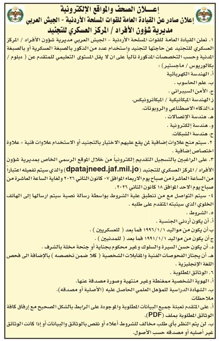 تعلن القيادة العامة للقوات المسلحة الأردنية – الجيش العربي / مديرية شؤون الأفراد – المركز العسكري للتجنيد عن حاجتها لتجنيد واستخدام عدد من الذكور بالصيغة العسكرية أو بالصبغة المدنية، وحسب التخصصات المذكورة تالياً، على أن لا يقل المستوى التعليمي للمتقدم عن (دبلوم، بكالوريوس، ماجستير).