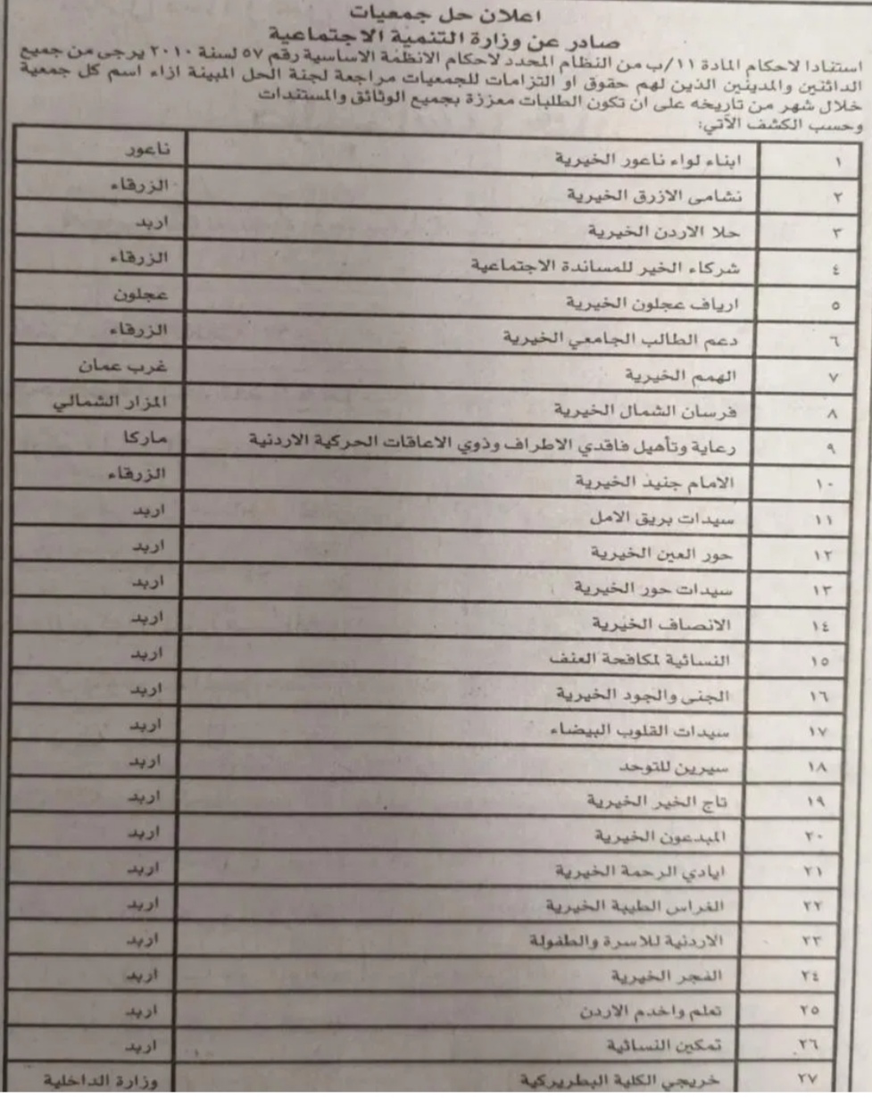 أخبار الأردن:الأردن:التنمية الاجتماعية تحل 27 جمعية خيرية (أسماء)
