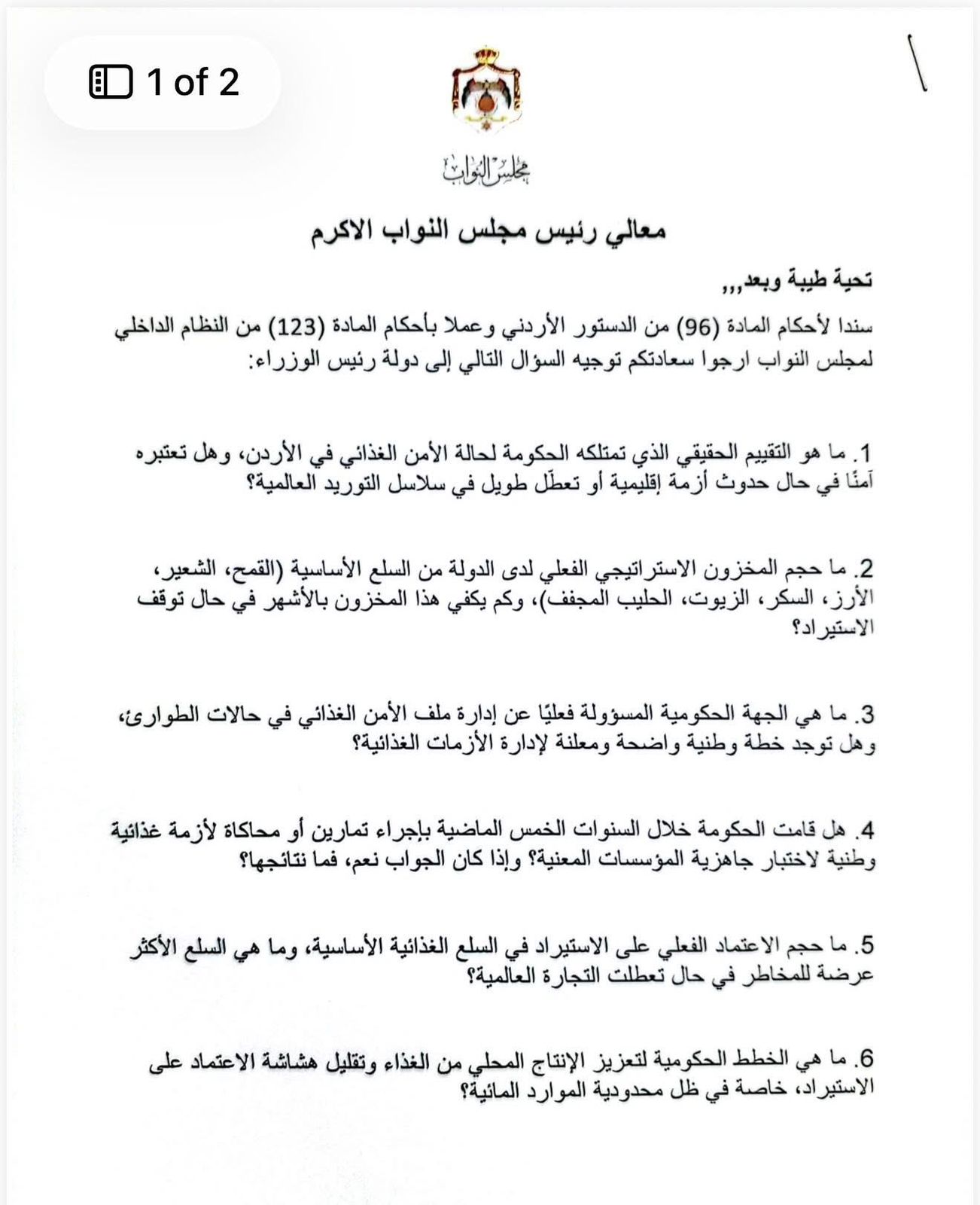 في ظل الأوضاع الاقليمية المتصاعدة وقرع طبول الحرب العالمية، ومن باب المتابعة للتدابير الاحتياطية للحكومة، وجهت النائب ديمة طهبوب سؤالا حول الأمن الغذائي وسلاسل التوريد، واستعدادات الحكومة في حالة الأزمات والطوارىء، وعن المخزون الاستراتيجي للسلع الاساسية ومدة كفايته