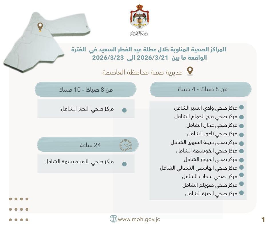 أعلنت وزارة الصحة، الخميس، عن أسماء المراكز الصحية المناوبة خلال عطلة عيد الفطر السعيد في الفترة الواقعة ما بين 21-23 آذار 2026, في جميع المحافظات.