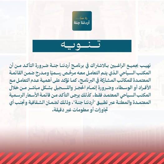 وأكّدت الوزارة في منشور على صفحة برنامج "أردننا جنة" على الفيسبوك أهمية عدم التعامل مع الأفراد أو الوسطاء، وضرورة إتمام إجراءات الحجز والتسجيل بشكل مباشر من خلال المكاتب السياحية المعتمدة فقط، وذلك حفاظًا على حقوق المشاركين وضمان جودة الخدمات المقدّمة.