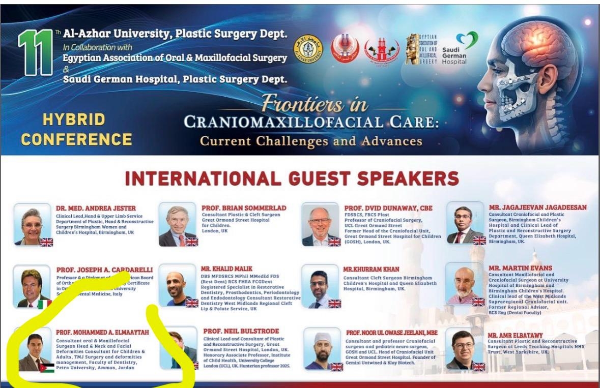 في مشهد علمي دولي رفيع المستوى، اختُتمت في القاهره- جمهورية مصر العربية- فعاليات المؤتمر الدولي للجراحات التجميلية والترميمية والحروق، بالتزامن مع مؤتمر جراحة الفم والوجه والفكين وقاع الجمجمة المصري و العالمي، وذلك بحضور عالمي لافت تجاوز أربعة آلاف جرّاح يمثلون أكثر من 80 دولة، في دلالة واضحة على مكانة هذا الحدث كمنصة علمية مرموقة رغم التحديات السياسية الراهنة. هذا و قد مثل المملكة الأردنية الهاشمية و جامعة البترا الاردنيه الدكتور محمد علي المعايطة.