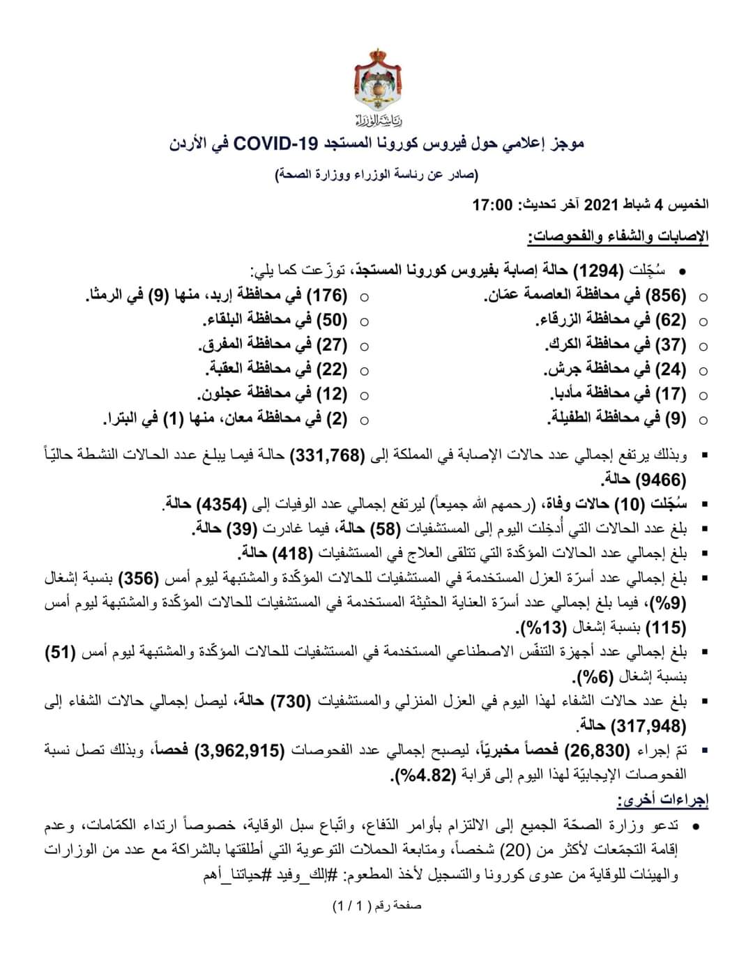 أخبار الأردن:سجل في المملكة اليوم 10 حالات وفاة و 1294 إصابة بفيروس كورونا