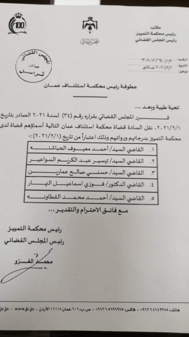 - قاضي محكمة استئناف عمان الدكتور/ فوزي اسماعيل النهار قاضياً لدى محكمة التمييز