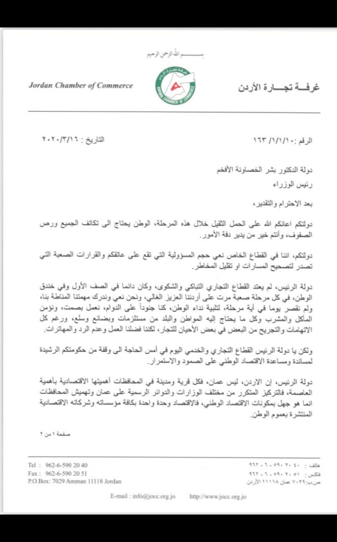 وجهت غرفة تجارة الأردن كتابا رسميا لرئيس الوزراء بشر الخصاونة، شرحت فيه أهمية إعادة النظر بساعات الحظر الجزئي وتمديدها قبل أن يؤدي ذلك لكوارث اقتصادية.