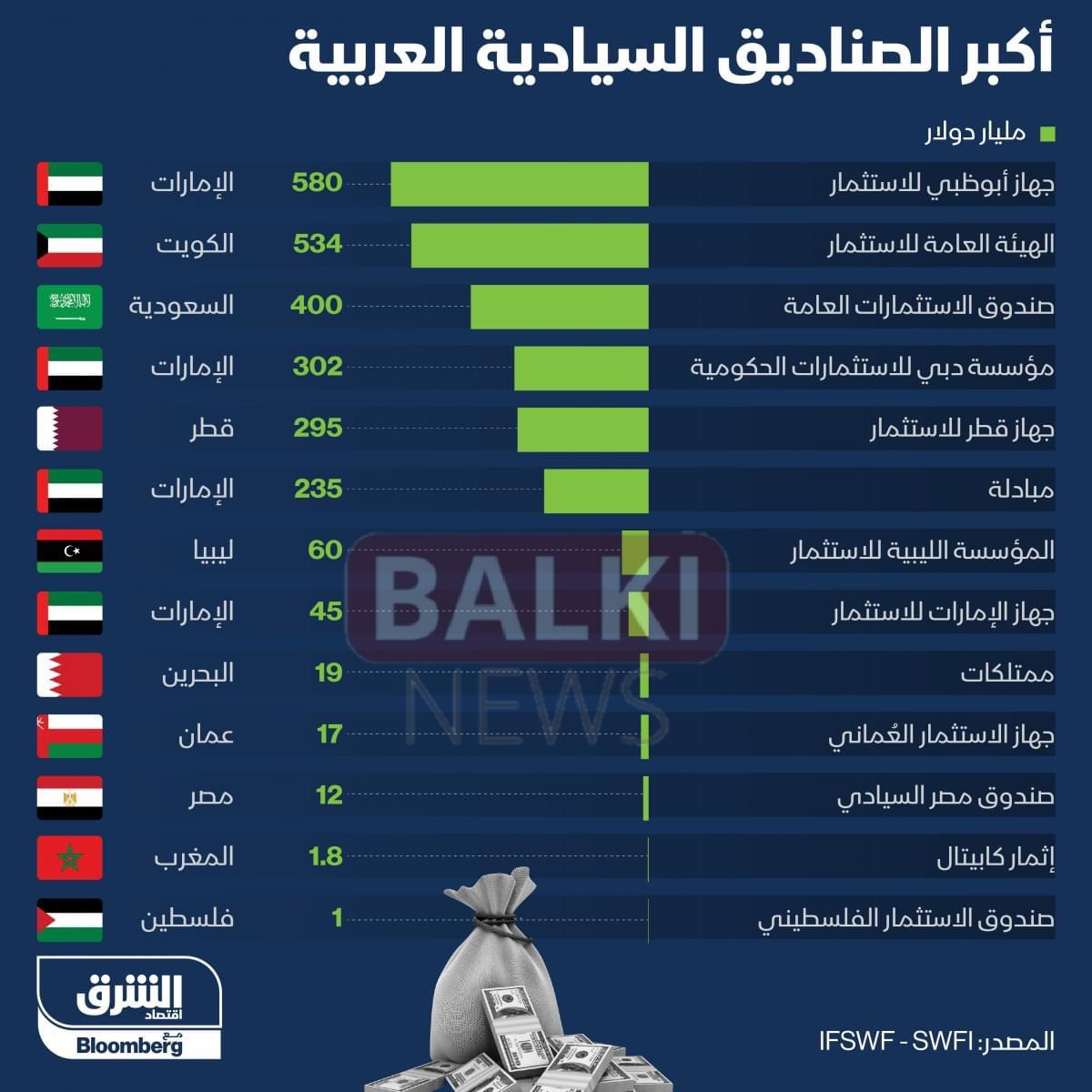 تصدَّر جهاز أبوظبي للاستثمار قائمة الصناديق السيادية العربية بحجم أصول بلغ 580 مليار دولار، تلاه الهيئة العامة للاستثمار الكويتية بقيمة 534 مليار دولار.