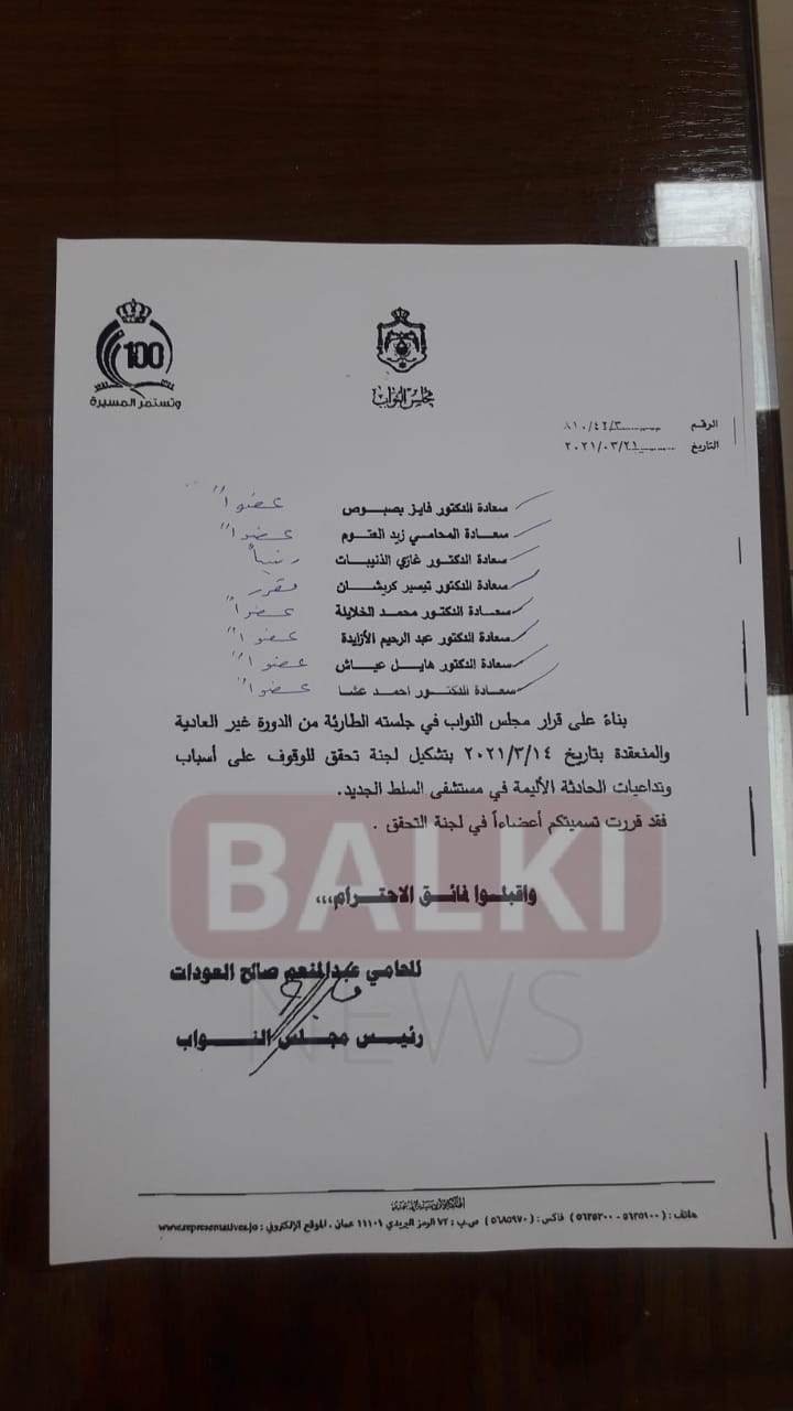 النواب ..الذنيبات رئيسا وكريشان مقررا للجنة التحقيق بحادث مستشفى السلط (وثيقة)