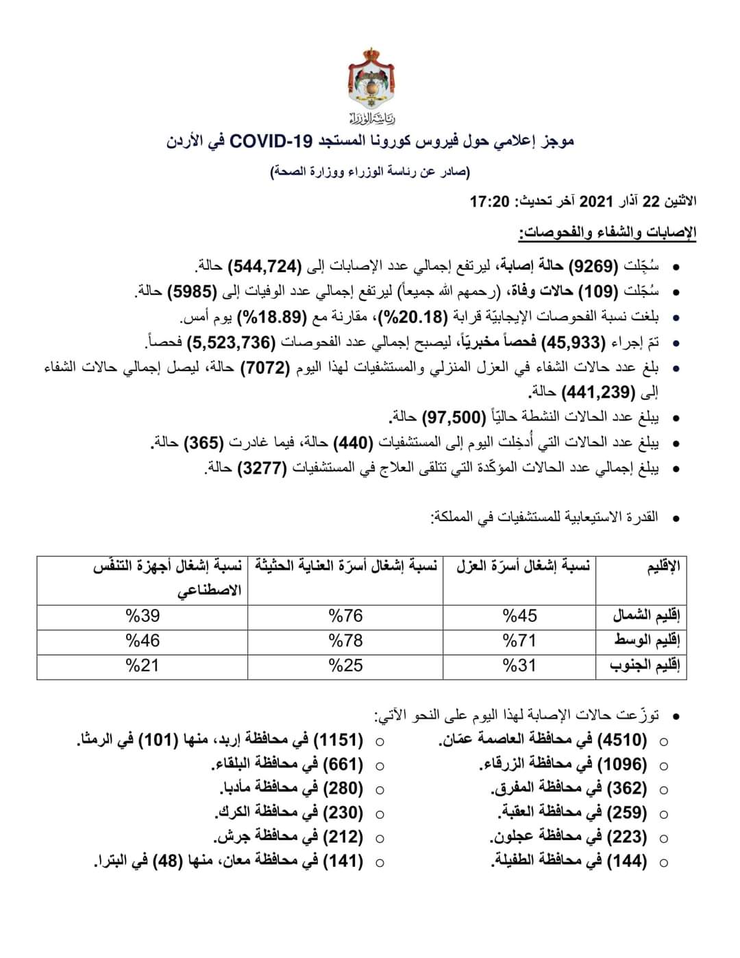 سجل في المملكة اليوم 109حالات وفاة و 9269 إصابة بفيروس كورونا