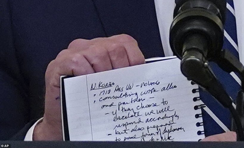 وقالت الصحيفة إن أوراق بايدن شملت صور وأسماء الصحفيين الذين يخطط لمنحهم فرصة لطرح الأسئلة، كما تضمنت نقاط معلومات سريعة، منها أن الولايات المتحدة تحتل المرتبة الثالثة عشرة في قائمة جودة البنية التحتية عالميا، بعد أن كانت في المرتبة الخامسة في عام 2002.