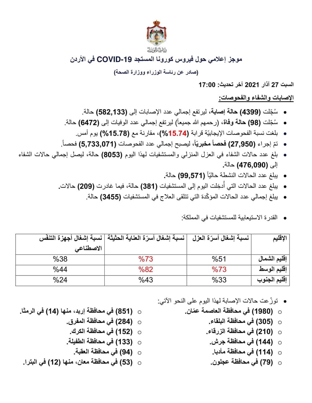 • سُجِّلت (4399) حالة إصابة، ليرتفع إجمالي عدد الإصابات إلى (582,133) حالة.