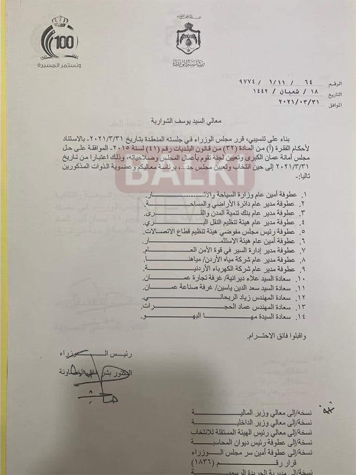 قرر دولة رئيس الوزراء تعين لجنة أمانة عمان المؤقتة معالي الدكتور يوسف الشواربة رئيساً وعضوية كل من أمين عام وزارة السياحة مدير عام دائرة الأراضي مدير إدارة السير مدير عام بنك تنمية المدن والقرى مدير عام هيئة تنظيم النقل البري رئيس هيئة تنظيم قطاع الاتصالات امين عام هيىة الايتثمار مدير شركة الكهرباء مدير عام شركة المياه ممثل غرفة تجارة عمان ممثل غرفة صناعة عمان المهندس زياد الريحاني المهندس عماد الحجرات السيدة مها البهو .