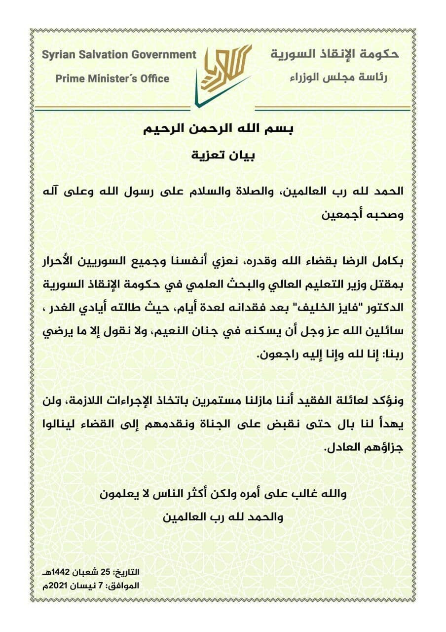 اغتال مجهولون وزير التعليم العالي والبحث العلمي في “حكومة الإنقاذ السورية” التي تعمل ضمن مناطق سيطرة “هيئة تحرير الشام” (النصرة سابقا).