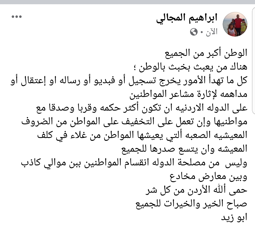 جاء ذلك من خلال ما نشره المجالي على حسابه عبر الفيسبوك قائلا :