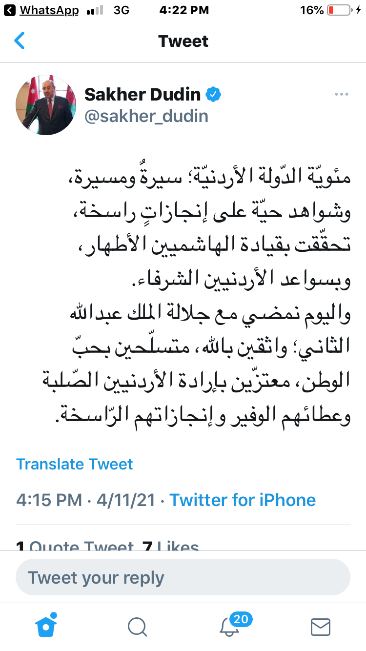 غرد المهندس صخر دودين وزير الأعلام على حسابه الرسمي عبر تويتر بمناسبة مئوية الدولة قائلا :