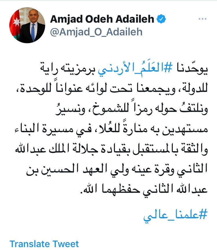 غرد السفير الأردني في القاهرة ومندوب الاردن الدائم بجامعة الدول العربية امجد العضايلة ، على حسابه الشخصي في موقع "تويتر"، بمناسبة اليوم الوطني للعلم بِمَا يلي :