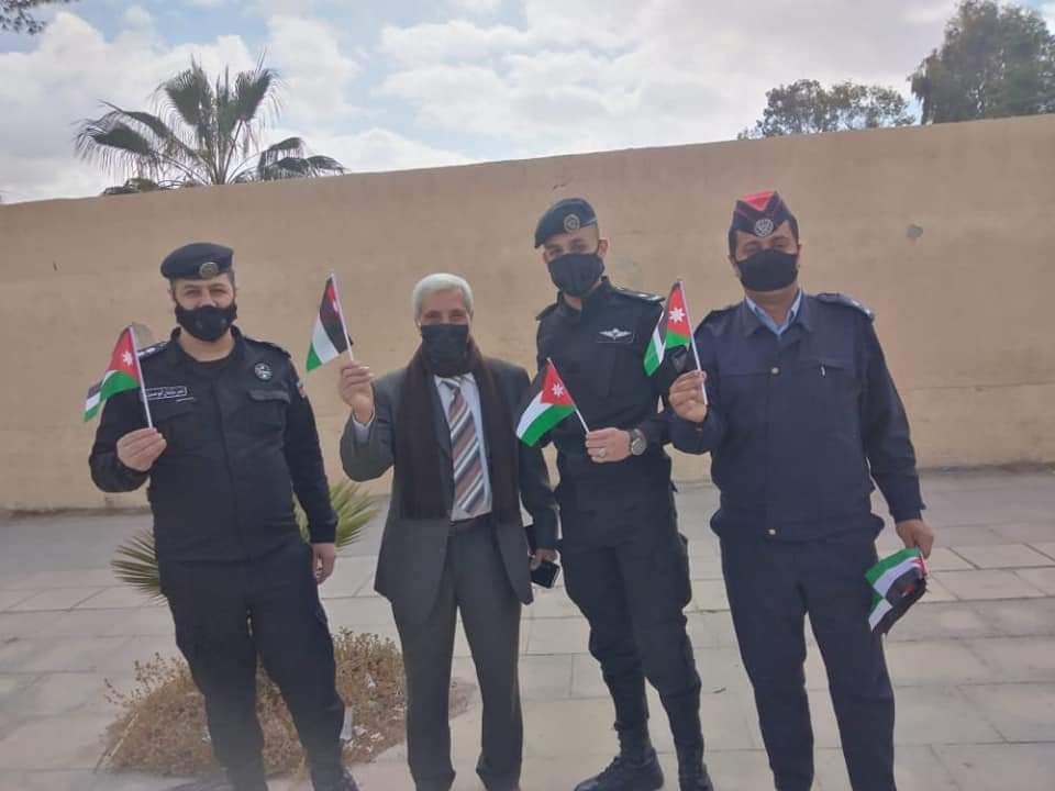 بدوره قام مكتب الشرطة المجتمعية في مركز امن المدينة/ المفرق بتوزيع العلم الأردني على مراجعي المركز الأمني وتقديم التهاني بمناسبة اليوم الوطني للعَلَم الأردني وكذلك تم توزيع العلم الأردني على سائقي المركبات في الوسط التجاري للمركز الأمني .