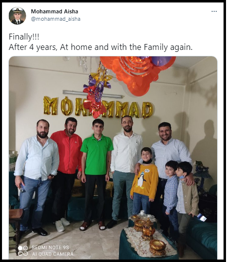 بكلمات مقتضبة لكنها مليئة بالفرح، أعلن البحار السوري محمد عائشة أنه "أخيرا، وبعد 4 سنوات"، صار في بيته ومع العائلة، بعد أشهر طويلة قضاها وحيدا على متن سفينة