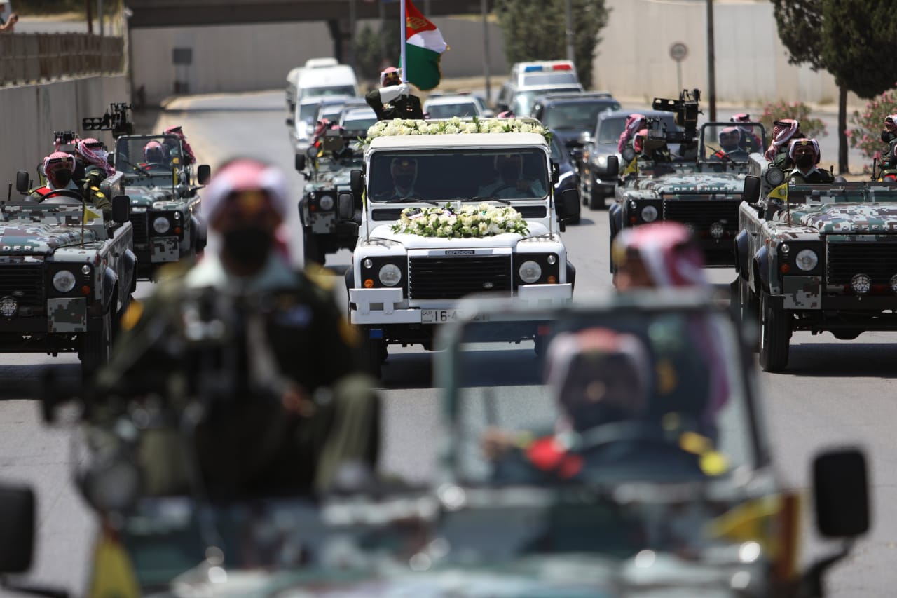 تحرك موكب تشييع جثمان المغفور له، بإذن الله، صاحب السمو الملكي الأمير محمد بن طلال المعظم من قصره، إلى مسجد قيادة الحرس الملكي الخاص، في موكب خاص.