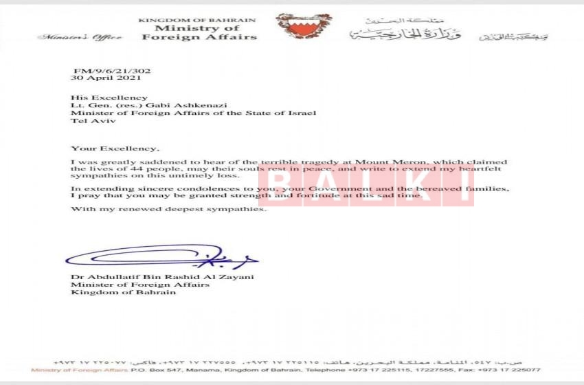 بعث وزير الخارجية البحريني عبد اللطيف الزياني برسالة تعزية إلى نظيره غابي أشكنازي وزير خارجية اسرائيل بوفاة ضحايا المجزرة على حد تعبيره التي وقعت في ميرون الليلة الماضية.