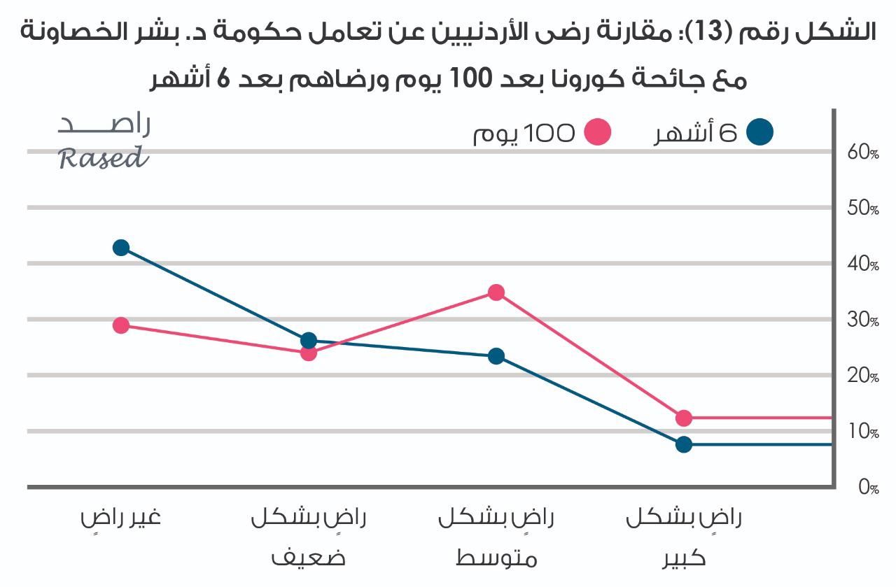 وبينت الدراسة تراجعاً برضا المواطنين عن أداء الحكومة في تعاملها مع جائحة كورونا، حيث كانت 47,1% خلال ال 100 يوم الأولى لتصل إلى 31% بعد ستة أشهر، فيما ارتفعت نسبة غير الراضين على تعامل الحكومة مع جائحة كورونا بعد ستة أشهر لتصل الى 42,9% من الأردنيين بينما كان غير الراضين بعد 100 يوم على تشكيل الحكومة 28,9% من الأردنيين.