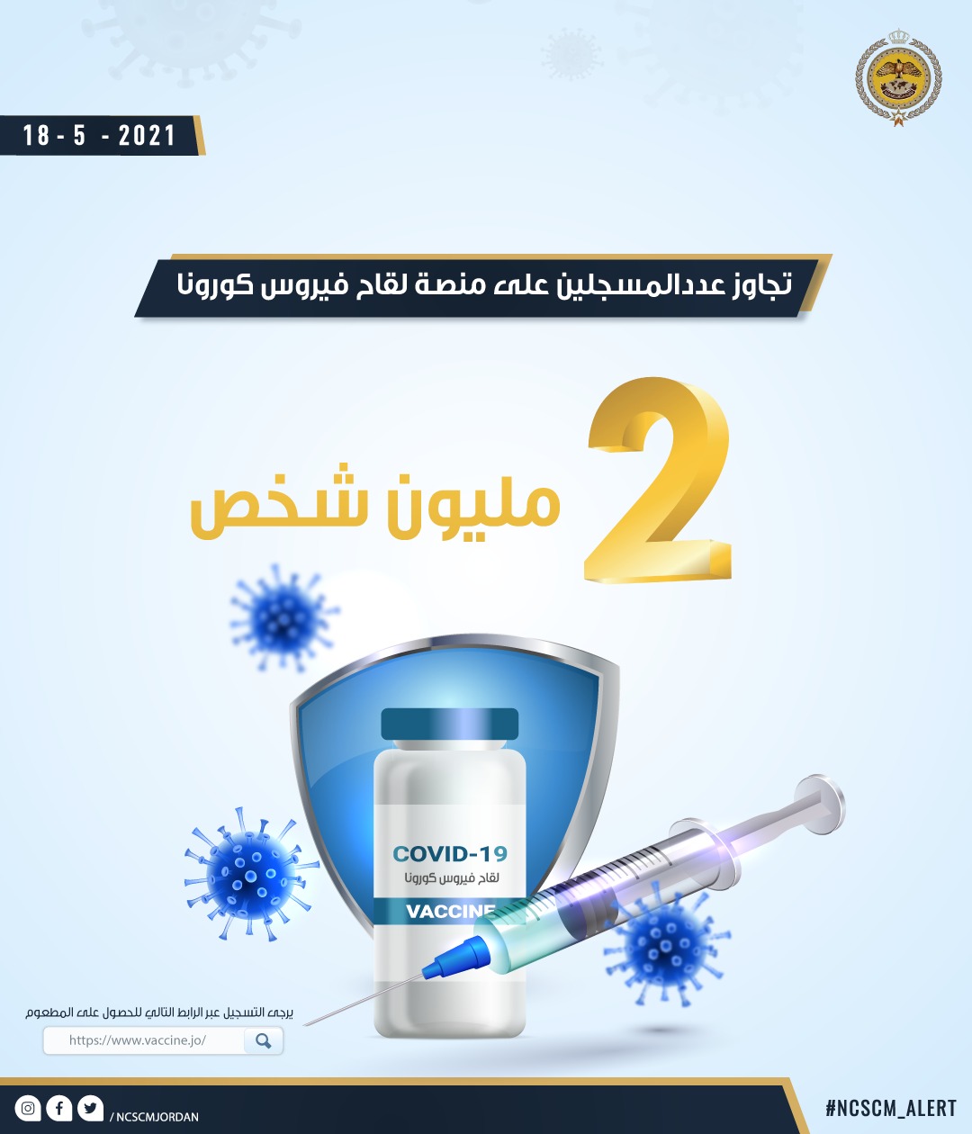 تعلن عمليات خلية الأزمة، في المركز الوطني للأمن وإدارة الأزمات عن تجاوز عدد المسجلين على منصة تلقي اللقاح المضاد لفايروس كورونا 2 مليون شخص.