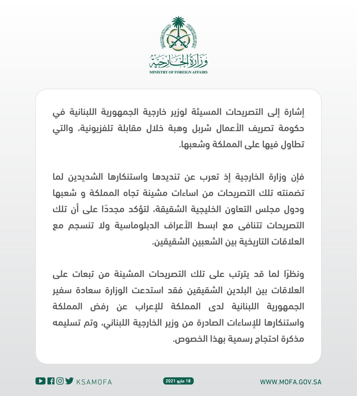 بيان وزارة الخارجية السعودية بشان تصريحات وزير الخارجية اللبناني التي تطاول فيها على المملكة وشعبها