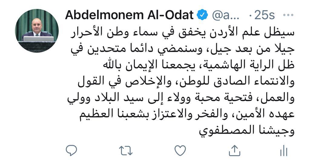 سيظل علم الأردن يخفق في سماء وطن الأحرار جيلا من بعد جيل، وسنمضي دائما متحدين في ظل الراية الهاشمية، يجمعنا الإيمان بالله والانتماء الصادق للوطن، والإخلاص في القول والعمل، فتحية محبة وولاء إلى سيد البلاد وولي عهده الأمين، والفخر والاعتزاز بشعبنا العظيم وجيشنا المصطفوي