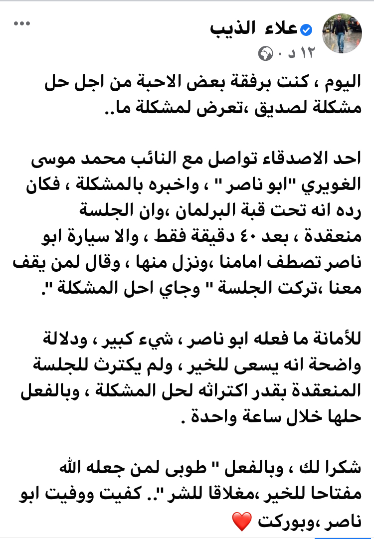كتب الاعلامي علاء الذيب على صفحته الخاصة عبر الفيسبوك ان مواطن من محافظة الزرقاء تعرض لمشكلة خاصة وبعد محاولات عديدة لحلها اتصل المواطن مع النائب موسى الغويري فما كان منه الا ان غادر جلسة النواب وتحرك بشكل عاجل للقاء المواطن والعمل بجد لحلها حتى نجح بذلك وجاء بنشر الذيب ما يلي :