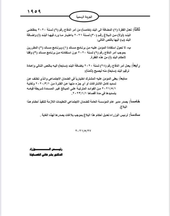 رئيس الوزراء الدكتور بشر الخصاونة يُصدِر البلاغ رقم (37) لسنة 2021م الذي ينظّم استفادة العاملين في منشآت القطاع السياحي من برنامج (استدامة) الذي تقدّمه المؤسّسة العامّة للضمان الاجتماعي.