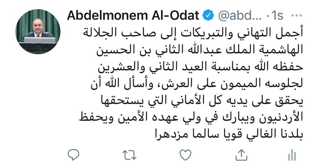 أجمل التهاني والتبريكات إلى صاحب الجلالة الهاشمية الملك عبدالله الثاني بن الحسين حفظه الله بمناسبة العيد الثاني والعشرين لجلوسه الميمون على العرش، وأسأل الله أن يحقق على يديه كل الأماني التي يستحقها الأردنيون ويبارك في ولي عهده الأمين ويحفظ بلدنا الغالي قويا سالما مزدهرا.