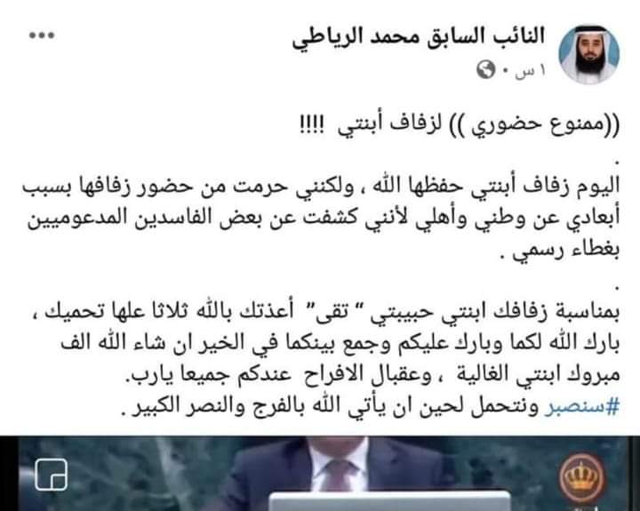 نشر النائب السابق عن محافظة العقبة السيد محمد الرياطي عبر صفحته على التواصل الاجتماعي، تاليا نص ما كتب: ((ممنوع حضوري )) لزفاف أبنتي !!!! .