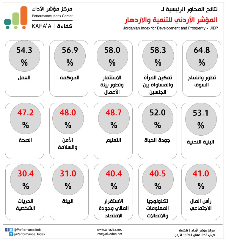 أطلق مركز مؤشر الأداء | كفاءة نتائج المؤشر الأردني للتنمية والازدهار عن العام 2020، والذي حل فيه محور تطور وانفتاح السوق كأكثر المحاور تقدماً بعلامة مكافئة مقدارها 64.8% والحريات الشخصية الأدنى بـ 30.4%.