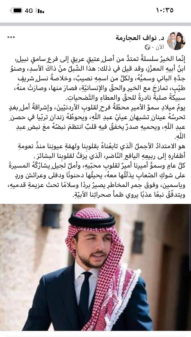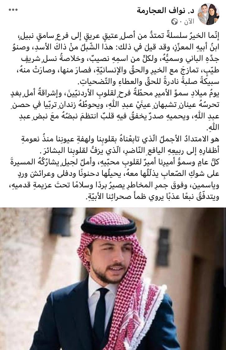 يومُ ميلادِ سموِّ الأميرِ محطّةُ فرحٍ لقلوبِ الأردنيّينَ، وإشراقةُ أملٍ بغدٍ تحرسُهُ عينانِ تشبهانِ عينَيْ عبدِ اللّٰهِ، ويحوطُهُ زندانِ تربّيا في حصنِ عبدِ اللّٰهِ، ويحميهِ صدرٌ يخفقُ فيهِ قلبٌ انتظمَ نبضُهُ معَ نبضِ عبدِ اللّٰهِ.