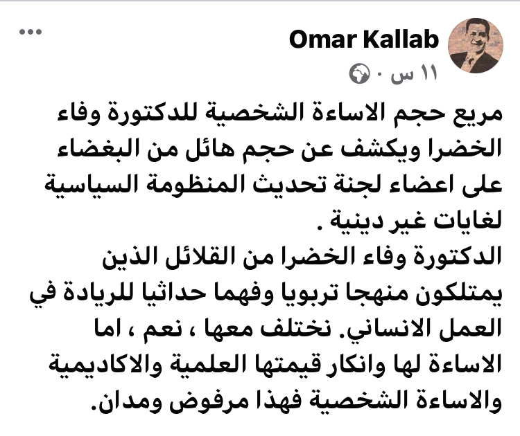 مريع حجم الاساءة الشخصية للدكتورة وفاء الخضرا ويكشف عن حجم هائل من البغضاء على اعضاء لجنة تحديث المنظومة السياسية لغايات غير دينية .