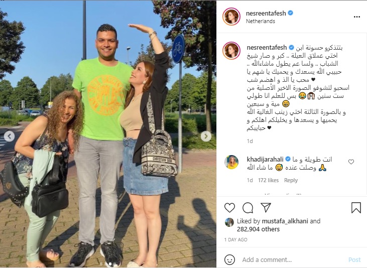 شاركت النجمة السورية من أصول فلسطينية نسرين طافش المتابعين مجموعة صور لها برفقة إبن أختها حسن وأختها زينب عبر صفحتها الخاصّة على “إنستغرام”. ونشرت نسرين الصور للتعليق على فرق الطول بينها وبين حسن، وقالت بطريقة فكاهية: “بتتذكرو حسونة ابن اختي عملاق العيلة .. كبر وصار شيخ الشباب .. ولسا عم يطول ماشاءالله ..حبيبي الله يسعدك و يحميك يا شهم يا محب يا ألذ وأهضم شب، اسحبو لتشوفو الصورة الأخيرة الأصلية من ست سنين، بس للعلم أنا طولي مية وسبعين، وبالصورة التالتة اختي زينب الغالية الله يحميها ويسعدها ويخليلكم اهلكم وحبايبكم”.
