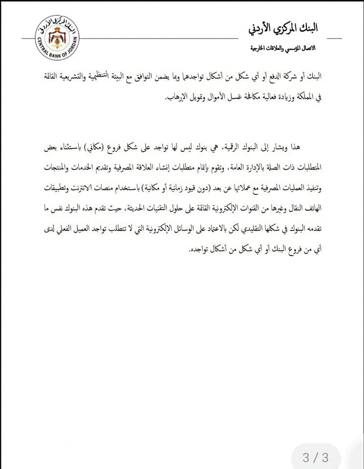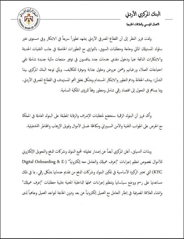 عاجل:البنك المركزي الأردني يعتزم ترخيص وتنظيم عملية انشاء البنوك الرقمية في الأردن.. على أن تخضع لنفس معايير الرقابة والضبط المطبقة على البنوك التقليدية"تفاصيل"
