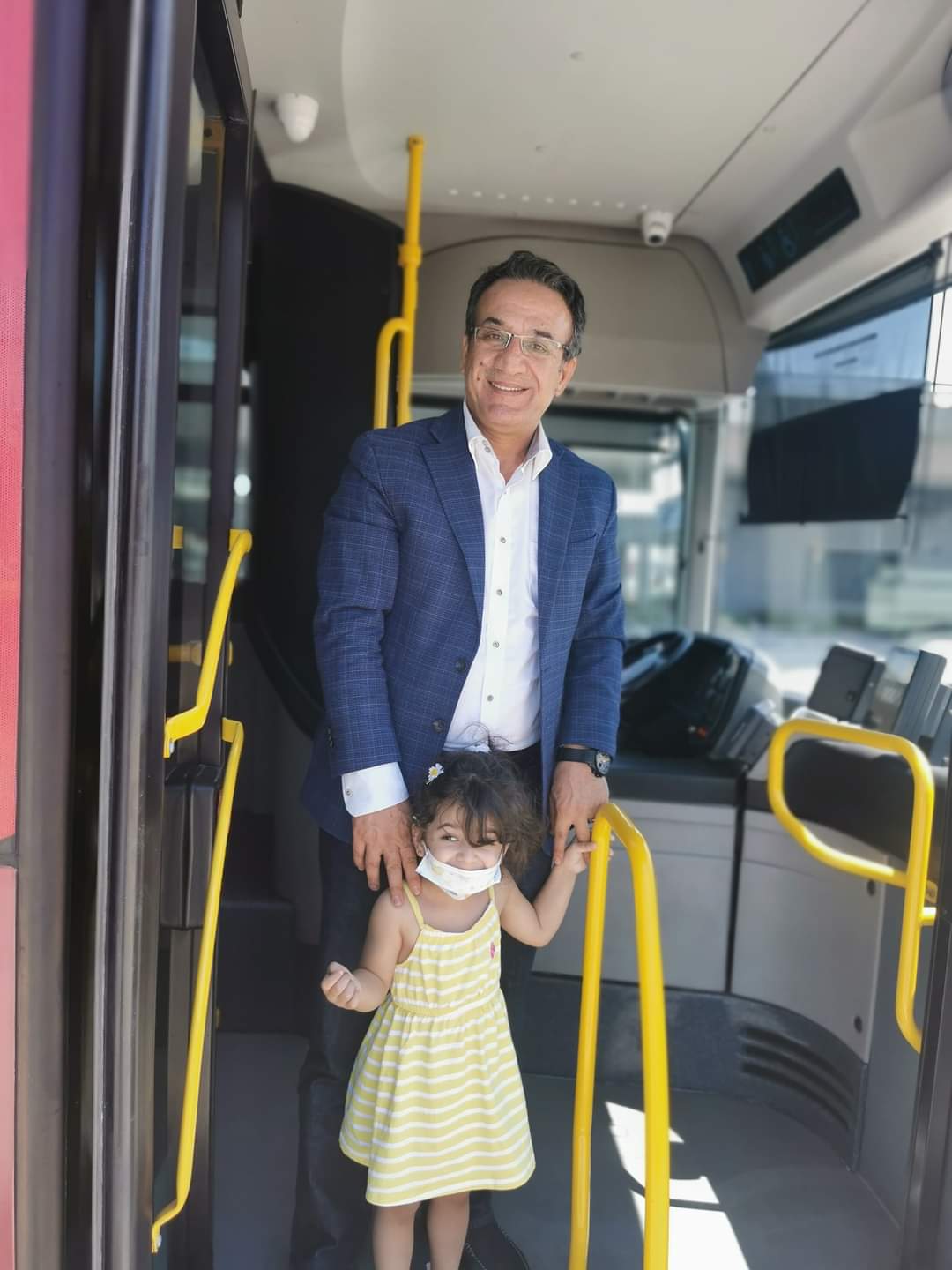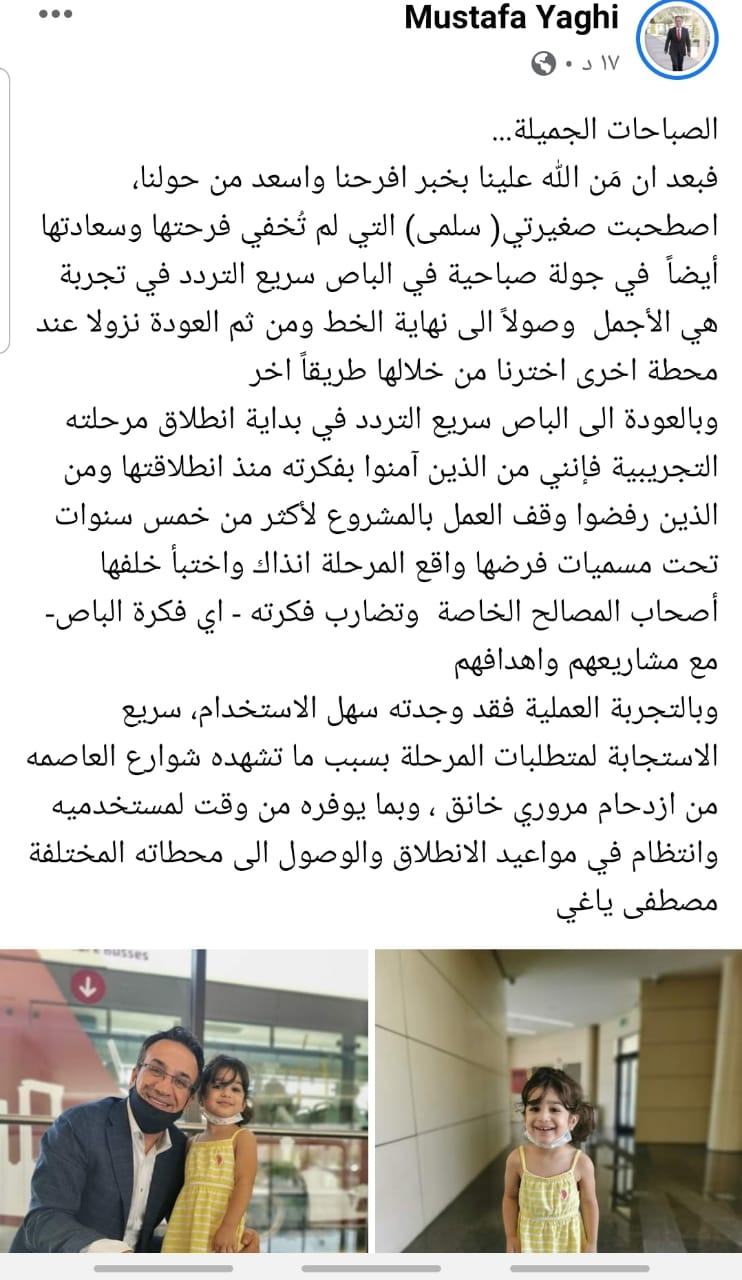 ونشر ياغي في منشور له عبر فيسبوك " فبعد ان مَن الله علينا بخبر افرحنا واسعد من حولنا، اصطحبت صغيرتي( سلمى) التي لم تُخفي فرحتها وسعادتها أيضاً في جولة صباحية في الباص سريع التردد في تجربة هي الأجمل وصولاً الى نهاية الخط ومن ثم العودة نزولا عند محطة اخرى اخترنا من خلالها طريقاً اخر"