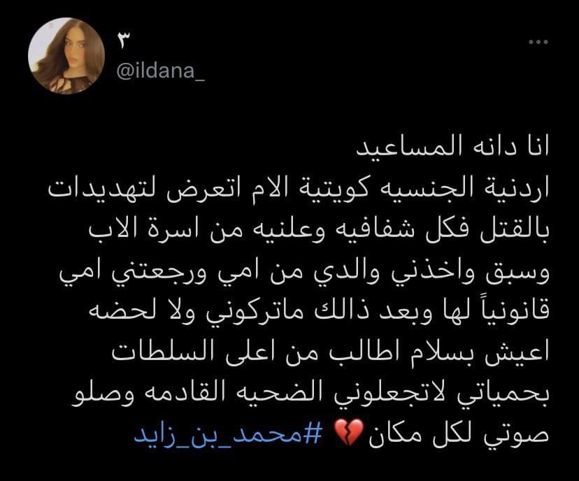 وقالت المساعيد عبر حسابها على مواقع التواصل الاجتماعي "أنا دانه المساعيد أردنية الجنسية كويتية الأم أتعرض لتهديدات بالقتل فكل شفافيه علنيه من أسرة الأب وسبق واخذني والدي من أمي ورجعتني أمي قانونيًا لها وبعد ذلك ما تركوني ولا لحظه أعيش بسلام أطالب من أعلى السلطات بحمياتي لا تجعلوني الضحية القادمة وصلوا صوتي لكل مكان #محمدبنزايد".