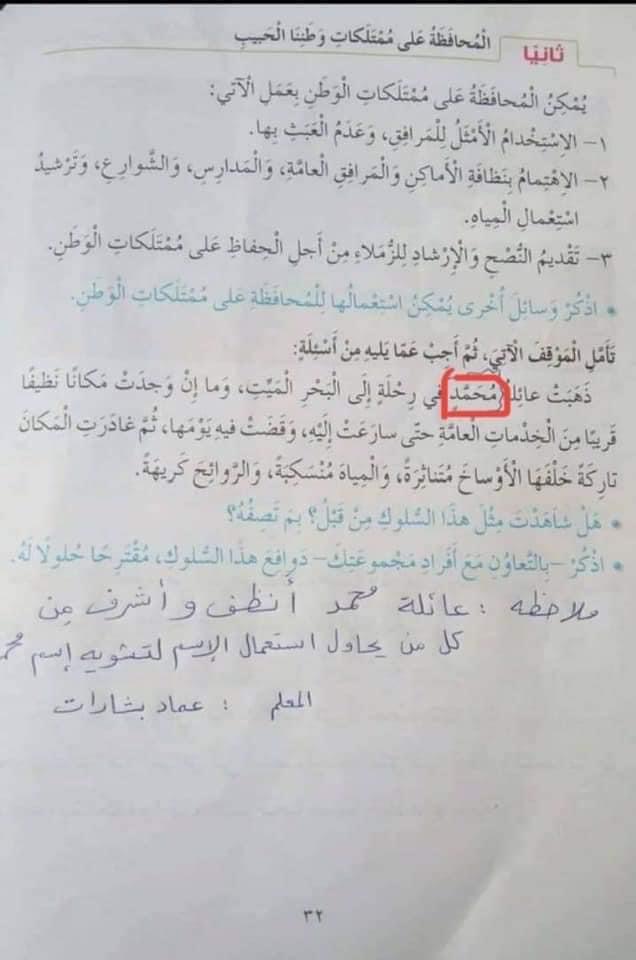 يتداول على مواقع وسائل التواصل الاجتماعي صورة من منهاج الصف الرابع الابتدائي وفيها جملة ( " ذهبت عائلة محمد في رحلة الى البحر الميت " ) والفقرة تخص درس متعلق بعدم المحافظة على النظافة في مواقع التنزه ، عدد كبير من الناس يتداول ذلك تحت بند ( تعمد استخدام اسم محمد بقصد الاساءة ) .